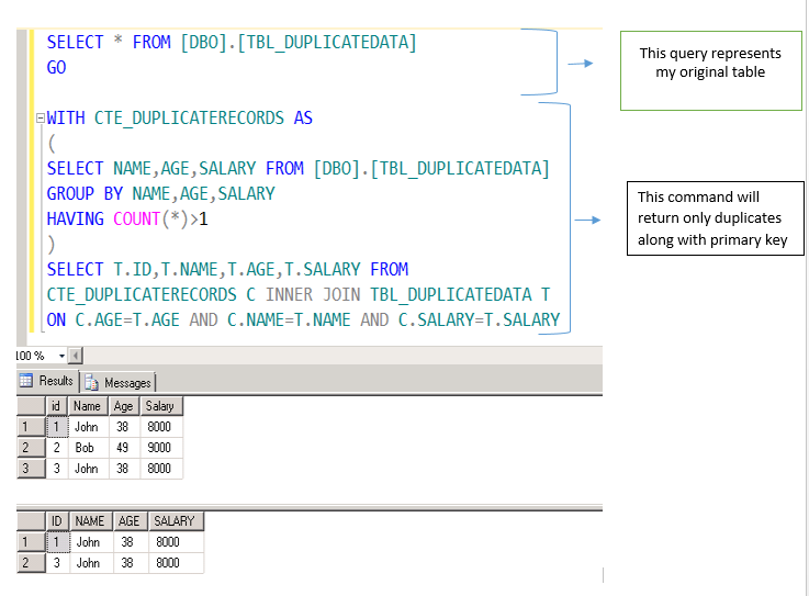 I have a table named [TBL_DUPLICATEDATA] which has duplicate records. Using Common Table Expression (CTE) , one can select only duplicate records in sql server along with its primary key values (which is id column). It is shown in the image below.