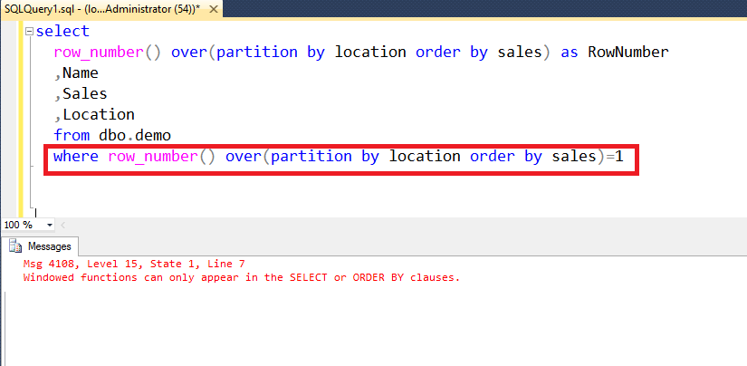 “Windowed functions can only appear in the SELECT or ORDER BY clauses.” This means that Window functions can’t be used in the where condition in T-SQL as shown in the image below.